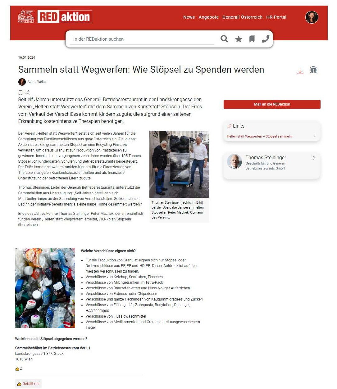 Hr. Steiniger(Küchenleitung) hat anlässlich der Abgabe im Dezember einen Artikel (©Fr. A.Weiss) in der Betriebszeitung verfasst. Danke für die Bemühungen um die Stöpsel! - Viele Menschen bemühen sich, unsere Sammel-Aktion zu unterstützen(siehe oben), das ist sehr löblich. JEDOCH Folgendes ist kontraproduktiv: