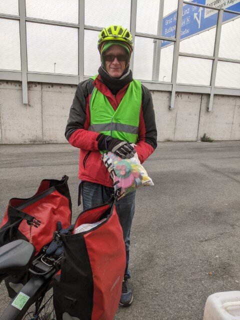 - Mit dem Fahrrad bringt ein Sammler seine Stöpsel-Sammlung (6,7kg) aus Süßenbrunn zum Container. Danke für den Enthusiásmus, bei -2º die ca 9 km Fahrtstrecke (und wieder zurück) auf sich zu nehmen und uns die Stöpsel zu bringen!