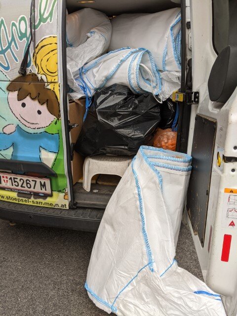 - In Oberösterreich werden eifrig Stöpsel gesammelt und Kurt Paukner bringt sie zum Lagerplatz, so auch heute die Ernte aus Linz und Eferding, die auch gleich abgefüllt wird. Es stehen 2 Big Bag kurz nach Abholung wieder gefüllt. Danke an Opa Oberhummer und Kurt!