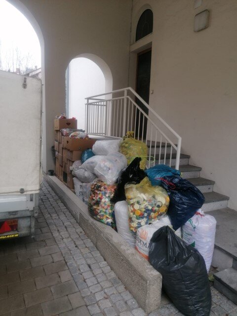 - Die Türe vom Lager in der Kirche "Zur Heiligen Familie" in Wels konnte nahezu nicht mehr geschlossen werden, denn so viele Säcke waren da. Fr. Fellinger mit Fam. Kalchmayer holten die Säcke aus dem Keller und beladen den Anhänger von Kurt, der 710 kg Stöpsel nach Roitham verfrachtet. Dort lagern mittlerweile 7 Big Bags. Danke an alle Beteiligten für die Freitags-Aktivität!