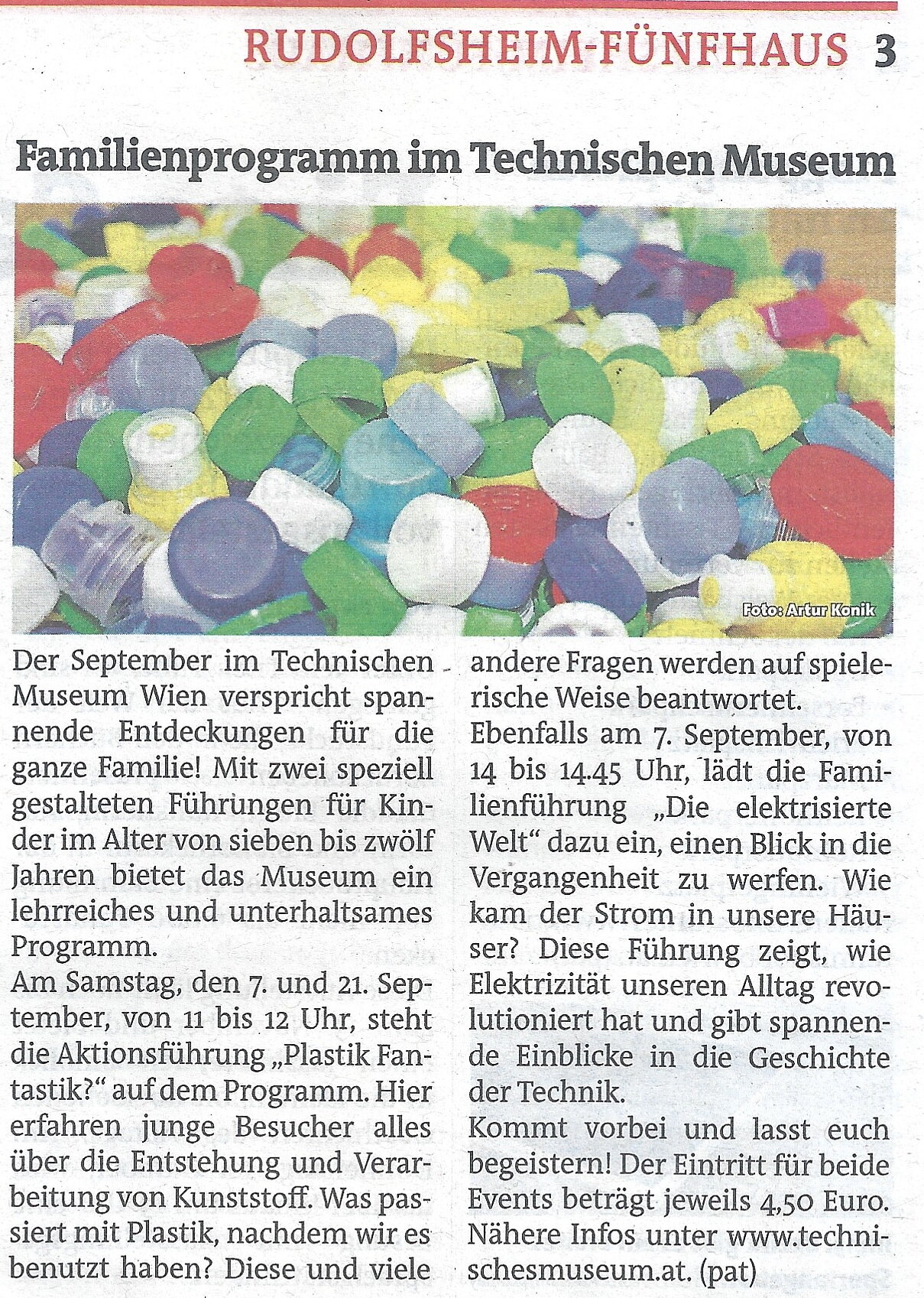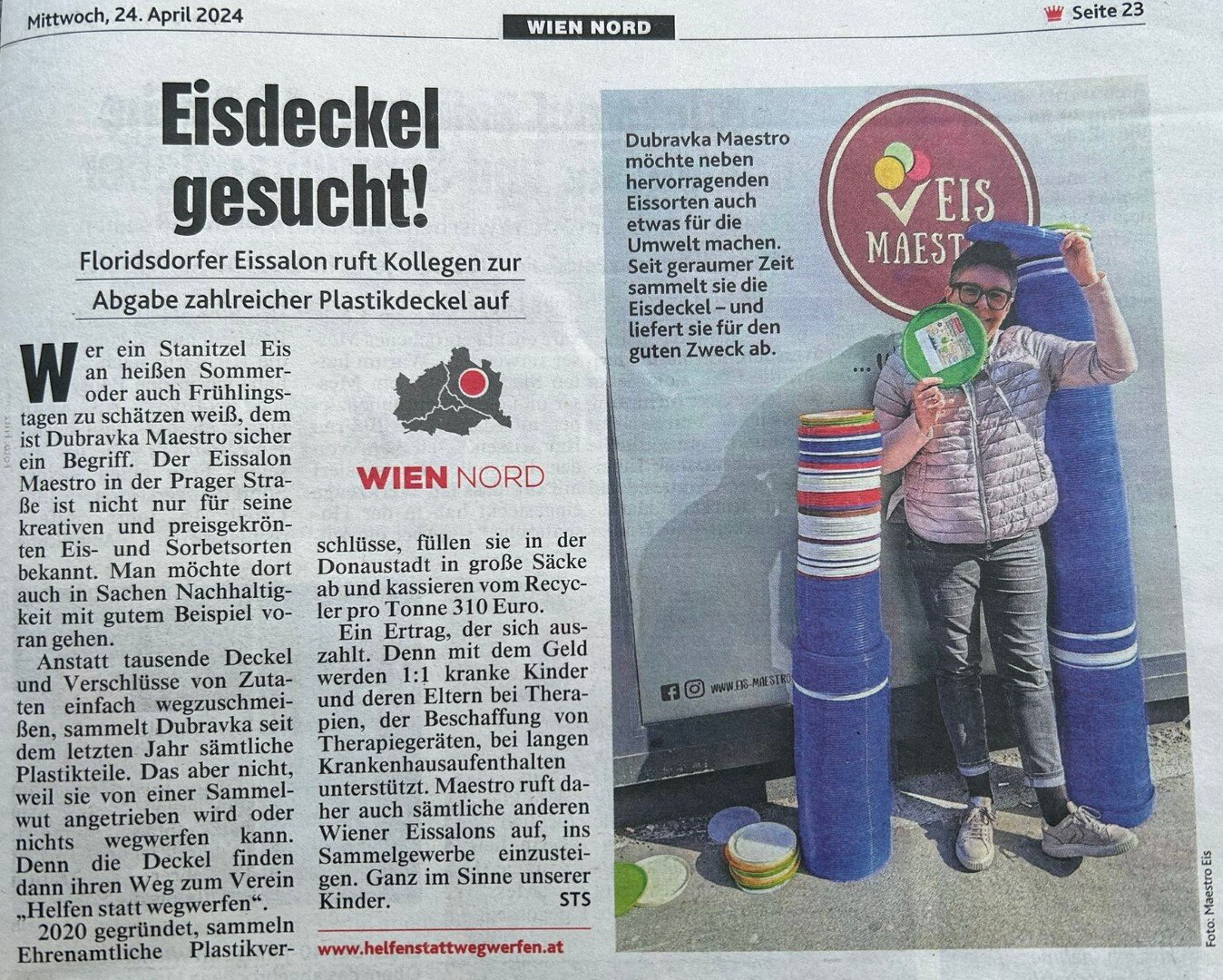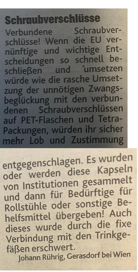 - Ein leider nicht ganz gelungener redaktioneller Beitrag in der KRONEN Zeitung (Ausgabe Wien Nord) bittet zum Sammeln von "Eis-Deckel", wobei eigentlich der Verschluss/Deckel der Milch-Kübel gemeint war. Die Deckel der Eis-Stanitzel sind meist aus PET. Hoffentlich kommen da nicht zu viele Fehlwürfe in die Sammlung. Auch beim Erlös hat sich ein Fehler eingeschlichen, leider gibt's nur € 260.-
