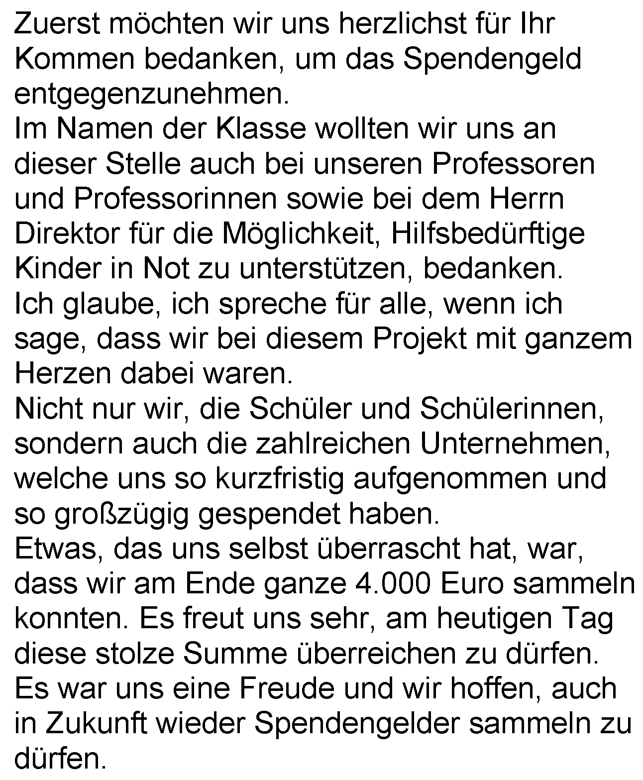 Nebst einer netten Ansprache vom Klassensprecher der 4B gab es den Spendenscheck, das Bargeld und ein Gruppenbild.
